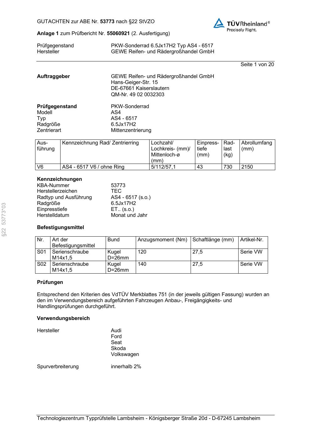 Felgengutachten / abe für Alufelgen GEWE AS4 - 6517 (ET 0, Mittenloch 0 mm) mit KBA 53773 (Zertifikatsnummer 53773). Hier kostenlos als PDF herunterladen. Der Download-Link ist 24 Stunden gültig und kann bis zu zwei Mal verwendet werden.