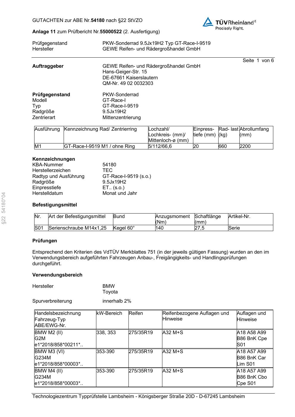 Dieses Gutachten (abe) bezieht sich auf die Alufelge GEWE GT-Race-I-9519 in der Ausführung ET 0, Mittenloch 0 mm (KBA 54180). Im PDF findest du typischerweise zulässige Reifengrößen, Auflagen/Anbauhinweise und – je nach Dokument – Hinweise zur Eintragung.