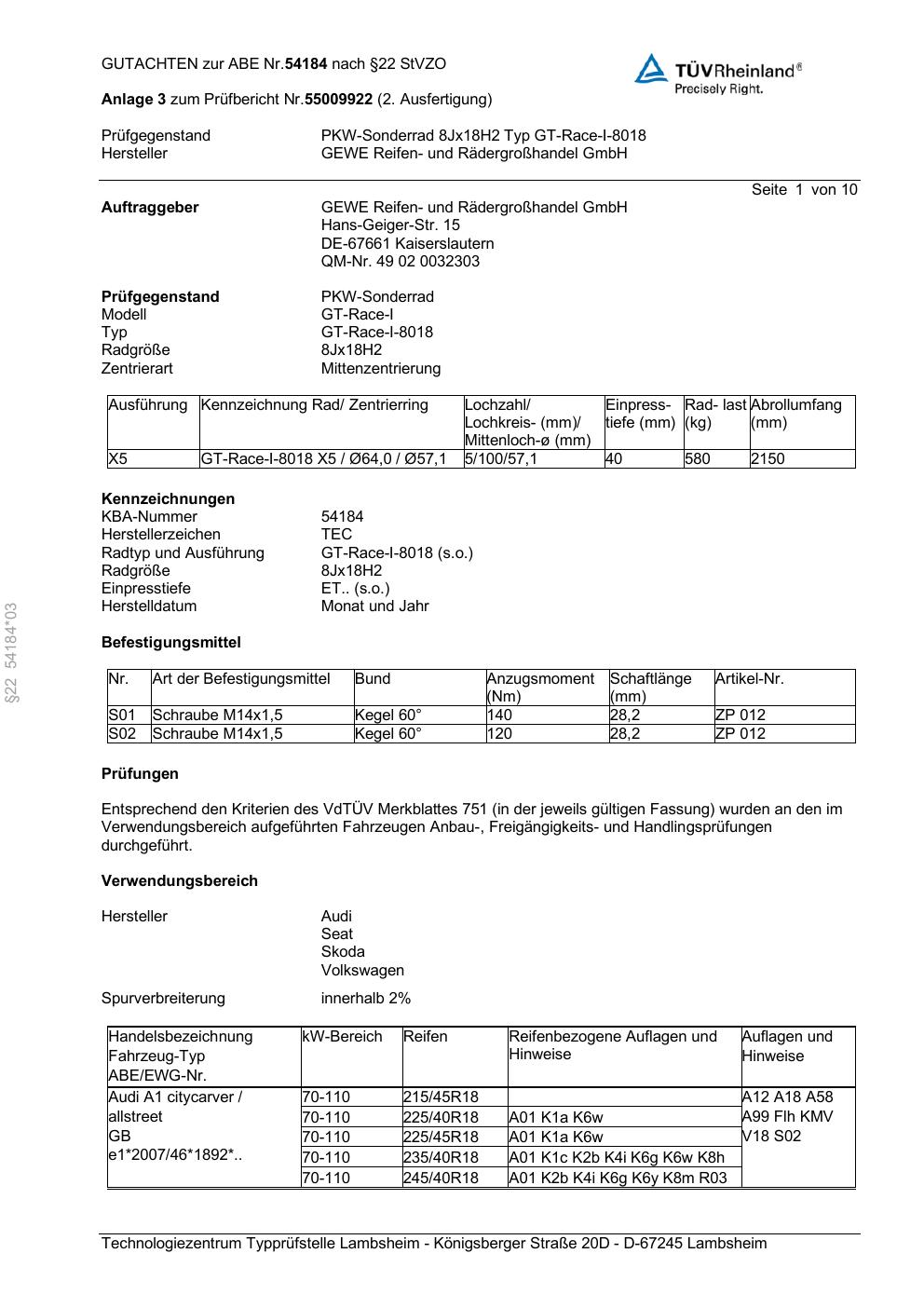 Felgengutachten / abe für Alufelgen GEWE GT-Race-I-8018 (ET 0, Mittenloch 0 mm) mit KBA 54184 (Zertifikatsnummer 54184). Hier kostenlos als PDF herunterladen. Der Download-Link ist 24 Stunden gültig und kann bis zu zwei Mal verwendet werden.