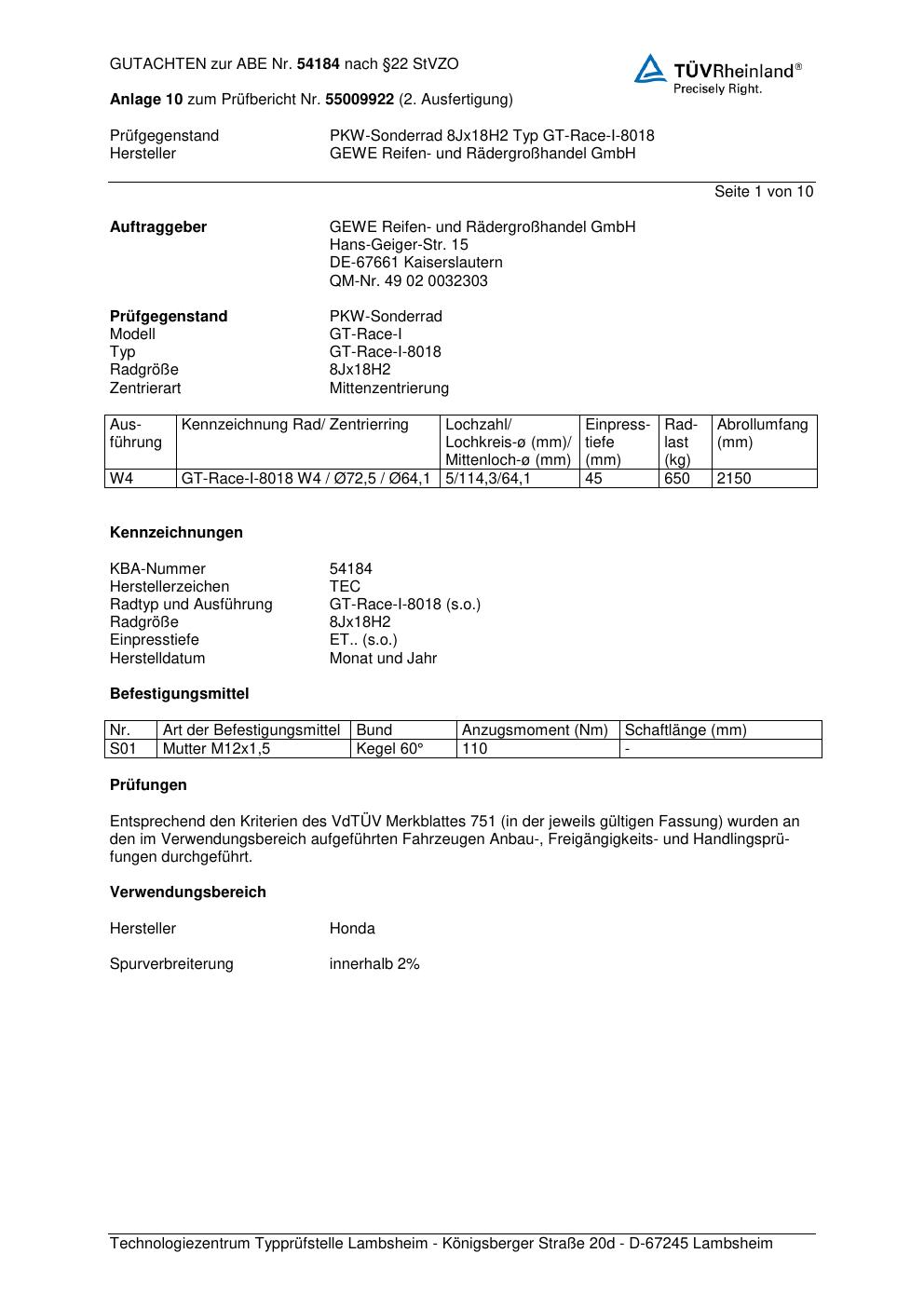 Dieses Gutachten (abe) bezieht sich auf die Alufelge GEWE GT-Race-I-8018 in der Ausführung ET 0, Mittenloch 0 mm (KBA 54184). Im PDF findest du typischerweise zulässige Reifengrößen, Auflagen/Anbauhinweise und – je nach Dokument – Hinweise zur Eintragung.