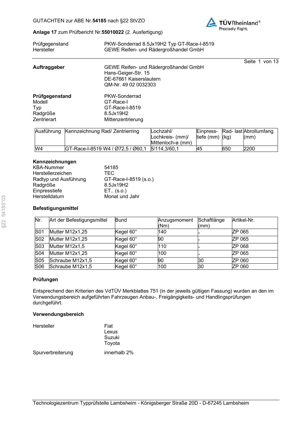 Dieses Gutachten (abe) bezieht sich auf die Alufelge GEWE GT-Race-I-85 19 in der Ausführung ET 0, Mittenloch 0 mm (KBA 54185). Im PDF findest du typischerweise zulässige Reifengrößen, Auflagen/Anbauhinweise und – je nach Dokument – Hinweise zur Eintragung.