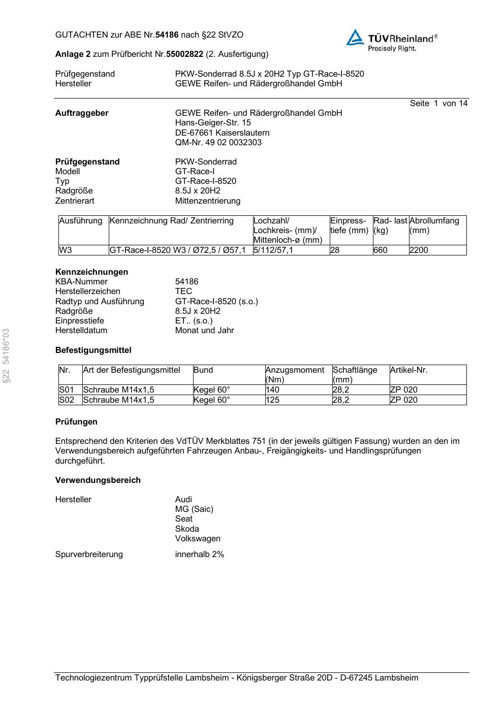 Felgengutachten / abe für Alufelgen GEWE GT-Race-I-8520 (ET 0, Mittenloch 0 mm) mit KBA 54186 (Zertifikatsnummer 54186). Hier kostenlos als PDF herunterladen. Der Download-Link ist 24 Stunden gültig und kann bis zu zwei Mal verwendet werden.