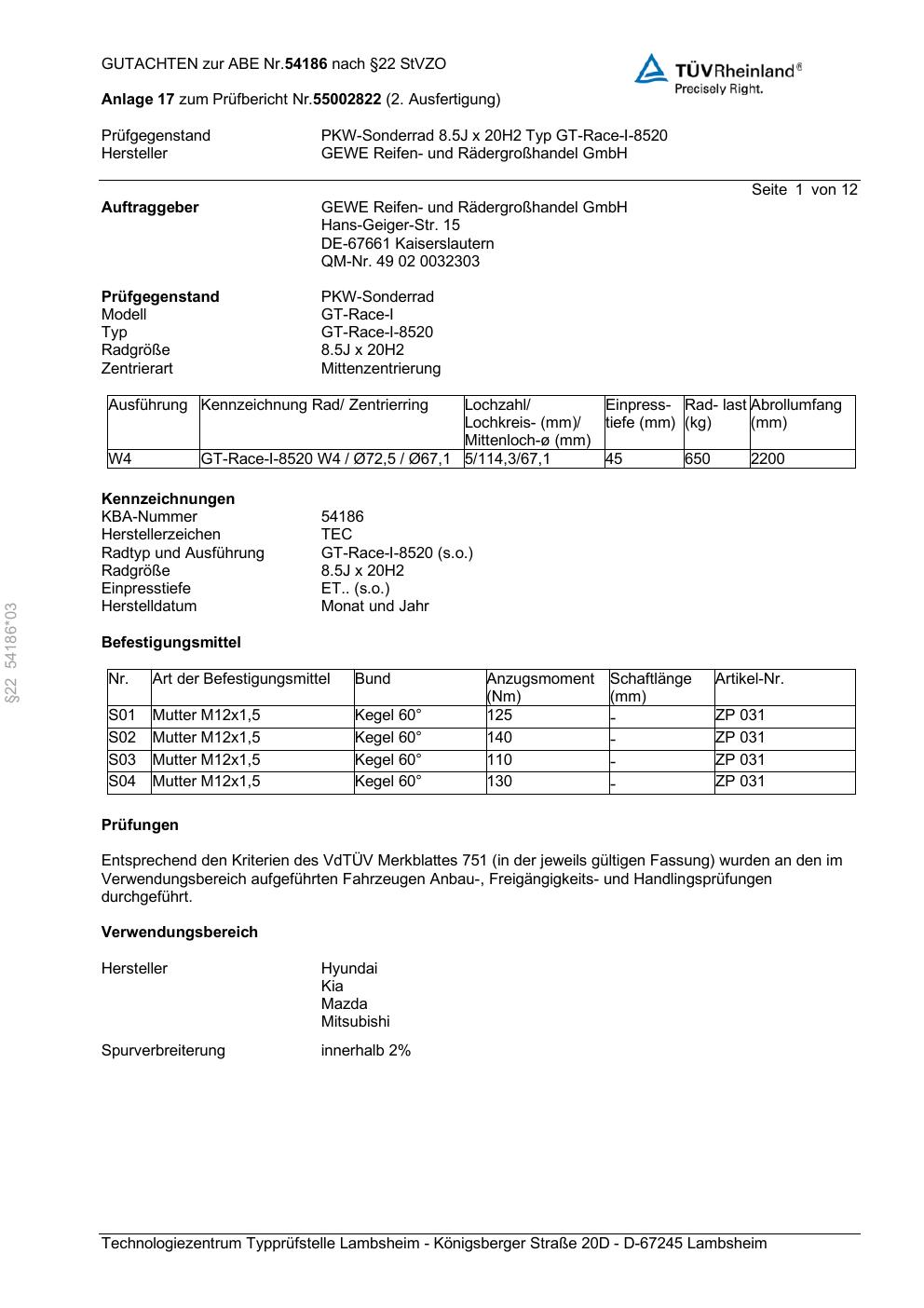 Dieses Gutachten (abe) bezieht sich auf die Alufelge GEWE GT-Race-I-8520 in der Ausführung ET 0, Mittenloch 0 mm (KBA 54186). Im PDF findest du typischerweise zulässige Reifengrößen, Auflagen/Anbauhinweise und – je nach Dokument – Hinweise zur Eintragung.