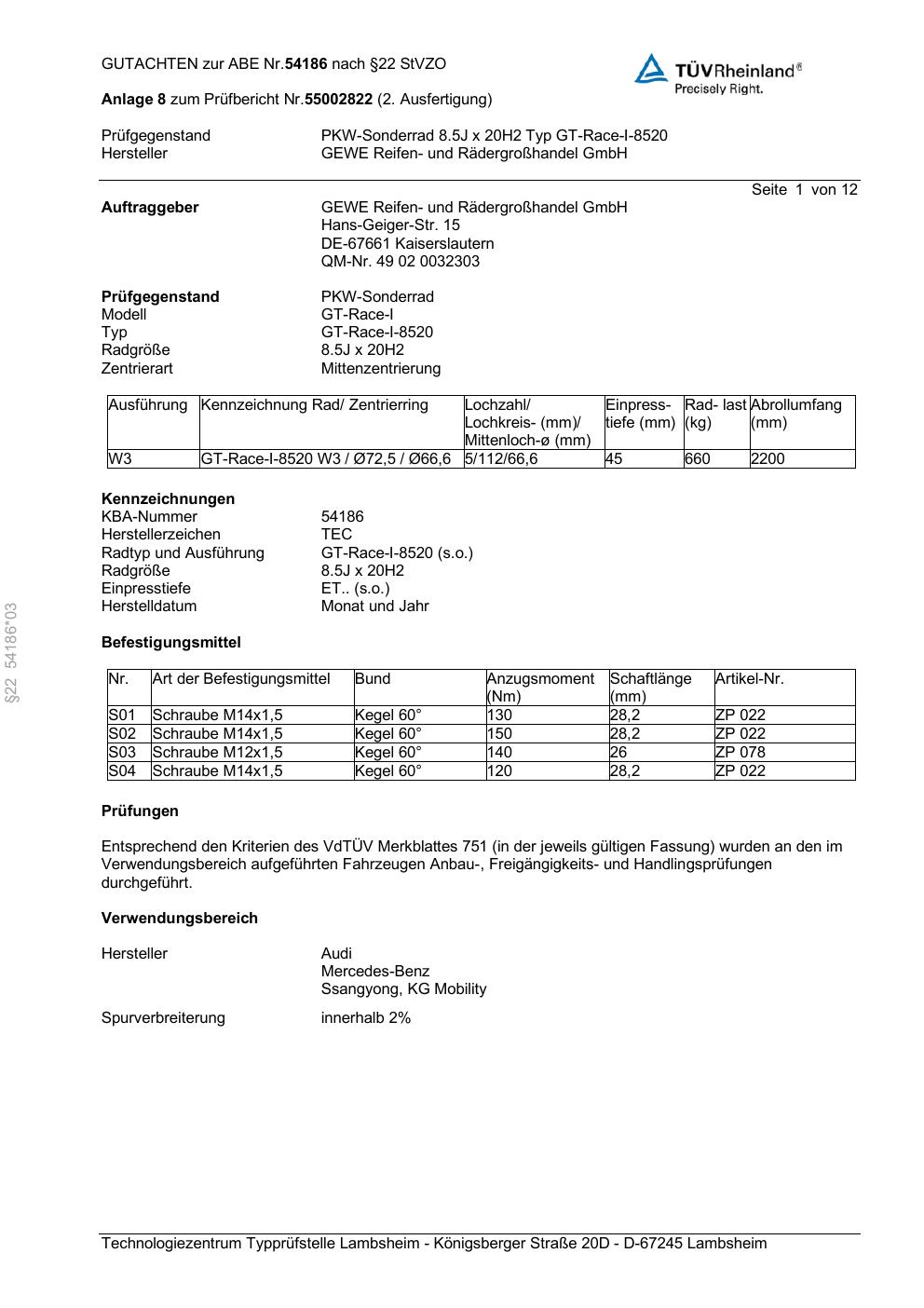 Dieses Gutachten (abe) bezieht sich auf die Alufelge GEWE GT-Race-I-8520 in der Ausführung ET 0, Mittenloch 0 mm (KBA 54186). Im PDF findest du typischerweise zulässige Reifengrößen, Auflagen/Anbauhinweise und – je nach Dokument – Hinweise zur Eintragung.