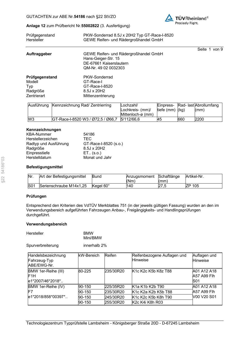 Dieses Gutachten (abe) bezieht sich auf die Alufelge GEWE GT-Race-I-8520 in der Ausführung ET 0, Mittenloch 0 mm (KBA 54186). Im PDF findest du typischerweise zulässige Reifengrößen, Auflagen/Anbauhinweise und – je nach Dokument – Hinweise zur Eintragung.