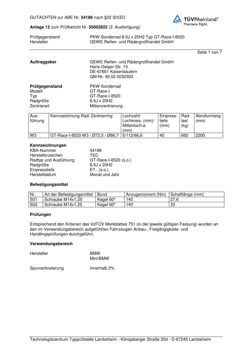 Dieses Gutachten (abe) bezieht sich auf die Alufelge GEWE GT-Race-I-8520 in der Ausführung ET 0, Mittenloch 0 mm (KBA 54186). Im PDF findest du typischerweise zulässige Reifengrößen, Auflagen/Anbauhinweise und – je nach Dokument – Hinweise zur Eintragung.