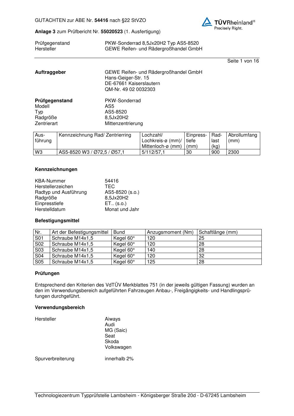 Dieses Gutachten (abe) bezieht sich auf die Alufelge GEWE AS5-8520 in der Ausführung ET 0, Mittenloch 0 mm (KBA 54416). Im PDF findest du typischerweise zulässige Reifengrößen, Auflagen/Anbauhinweise und – je nach Dokument – Hinweise zur Eintragung.