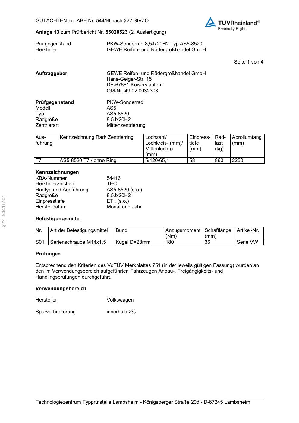 Dieses Gutachten (abe) bezieht sich auf die Alufelge GEWE AS5-8520 in der Ausführung ET 0, Mittenloch 0 mm (KBA 54416). Im PDF findest du typischerweise zulässige Reifengrößen, Auflagen/Anbauhinweise und – je nach Dokument – Hinweise zur Eintragung.