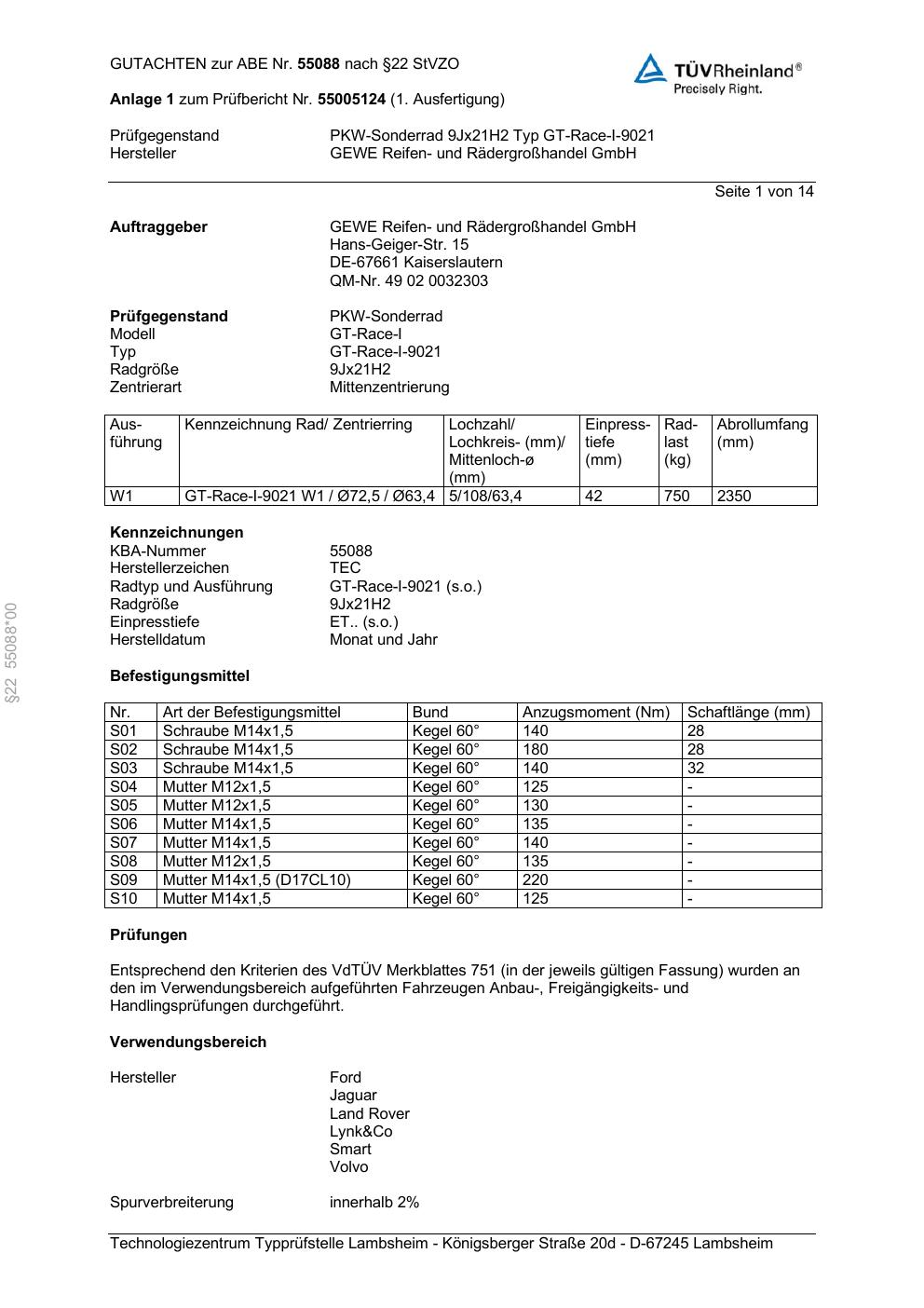 Dieses Gutachten (abe) bezieht sich auf die Alufelge GEWE Reifen- und Rädergroenhandel GmbH GT-Race-I-9021 in der Ausführung ET 0, Mittenloch 0 mm (KBA 55088). Im PDF findest du typischerweise zulässige Reifengrößen, Auflagen/Anbauhinweise und – je nach Dokument – Hinweise zur Eintragung.