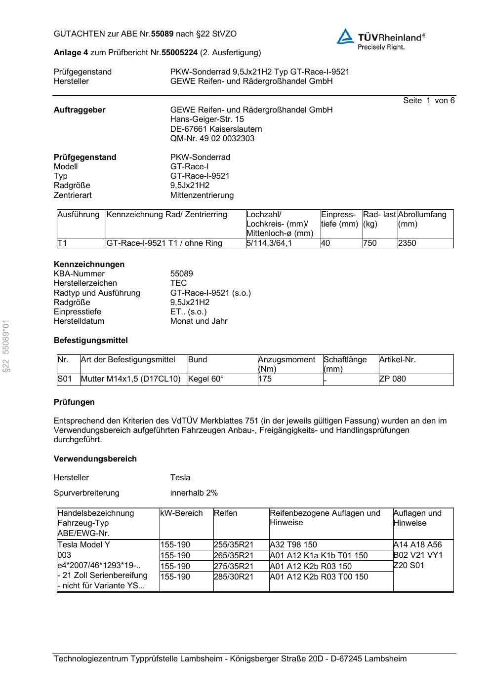 Dieses Gutachten (abe) bezieht sich auf die Alufelge GEWE GT-Race-I-95 21 in der Ausführung ET 0, Mittenloch 0 mm (KBA 55089). Im PDF findest du typischerweise zulässige Reifengrößen, Auflagen/Anbauhinweise und – je nach Dokument – Hinweise zur Eintragung.