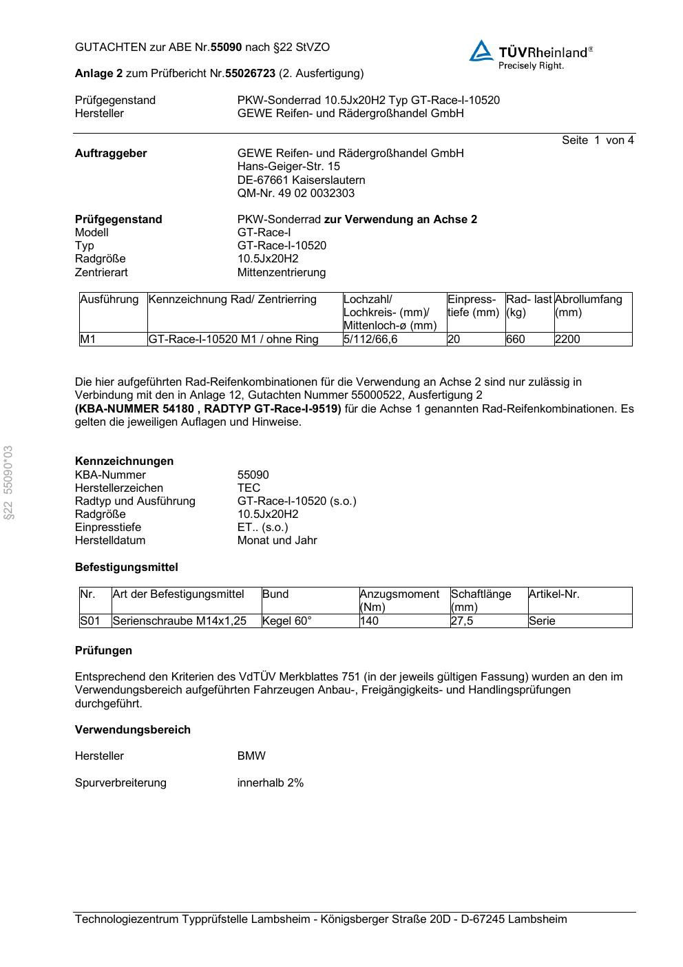 Felgengutachten / abe für Alufelgen GEWE GT-Race-I-10520 (ET 0, Mittenloch 0 mm) mit KBA 55090 (Zertifikatsnummer 55090). Hier kostenlos als PDF herunterladen. Der Download-Link ist 24 Stunden gültig und kann bis zu zwei Mal verwendet werden.