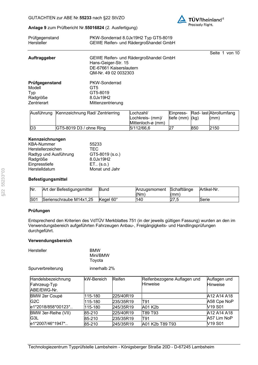 Dieses Gutachten (abe) bezieht sich auf die Alufelge GEWE GT5-8019 in der Ausführung ET 0, Mittenloch 0 mm (KBA 55233). Im PDF findest du typischerweise zulässige Reifengrößen, Auflagen/Anbauhinweise und – je nach Dokument – Hinweise zur Eintragung.