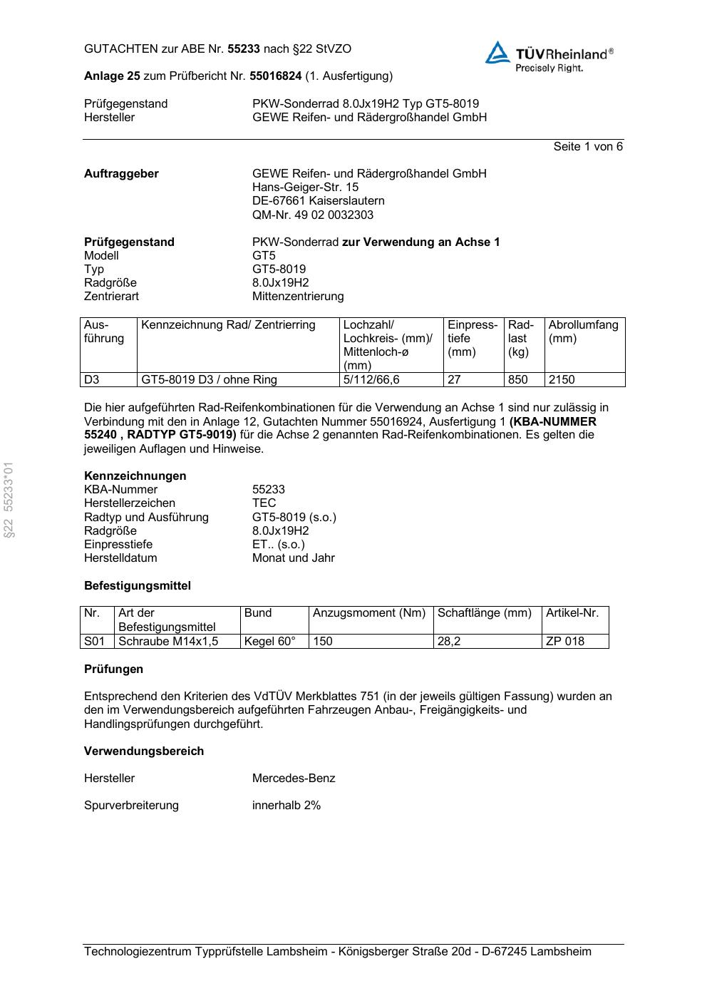 Dieses Gutachten (abe) bezieht sich auf die Alufelge GEWE GT5-8019 in der Ausführung ET 0, Mittenloch 0 mm (KBA 55233). Im PDF findest du typischerweise zulässige Reifengrößen, Auflagen/Anbauhinweise und – je nach Dokument – Hinweise zur Eintragung.
