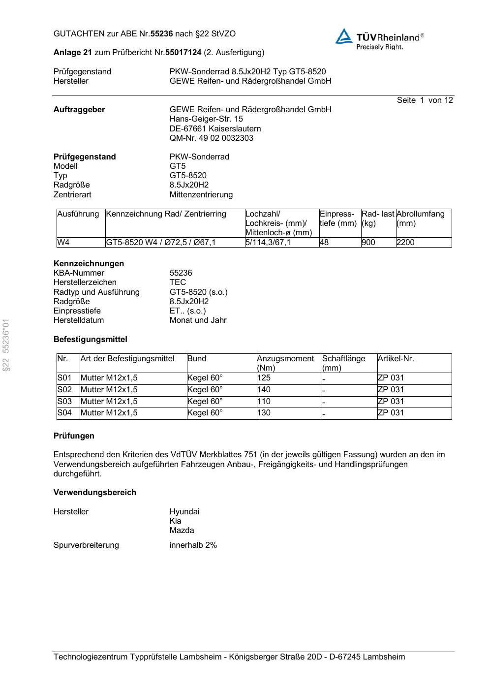 Dieses Gutachten (abe) bezieht sich auf die Alufelge GEWE GT5-8520 in der Ausführung ET 0, Mittenloch 0 mm (KBA 55236). Im PDF findest du typischerweise zulässige Reifengrößen, Auflagen/Anbauhinweise und – je nach Dokument – Hinweise zur Eintragung.