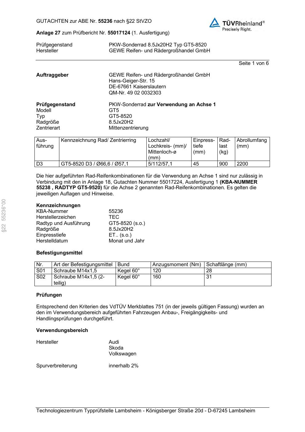 Dieses Gutachten (abe) bezieht sich auf die Alufelge GEWE GT5-8520 in der Ausführung ET 0, Mittenloch 0 mm (KBA 55236). Im PDF findest du typischerweise zulässige Reifengrößen, Auflagen/Anbauhinweise und – je nach Dokument – Hinweise zur Eintragung.