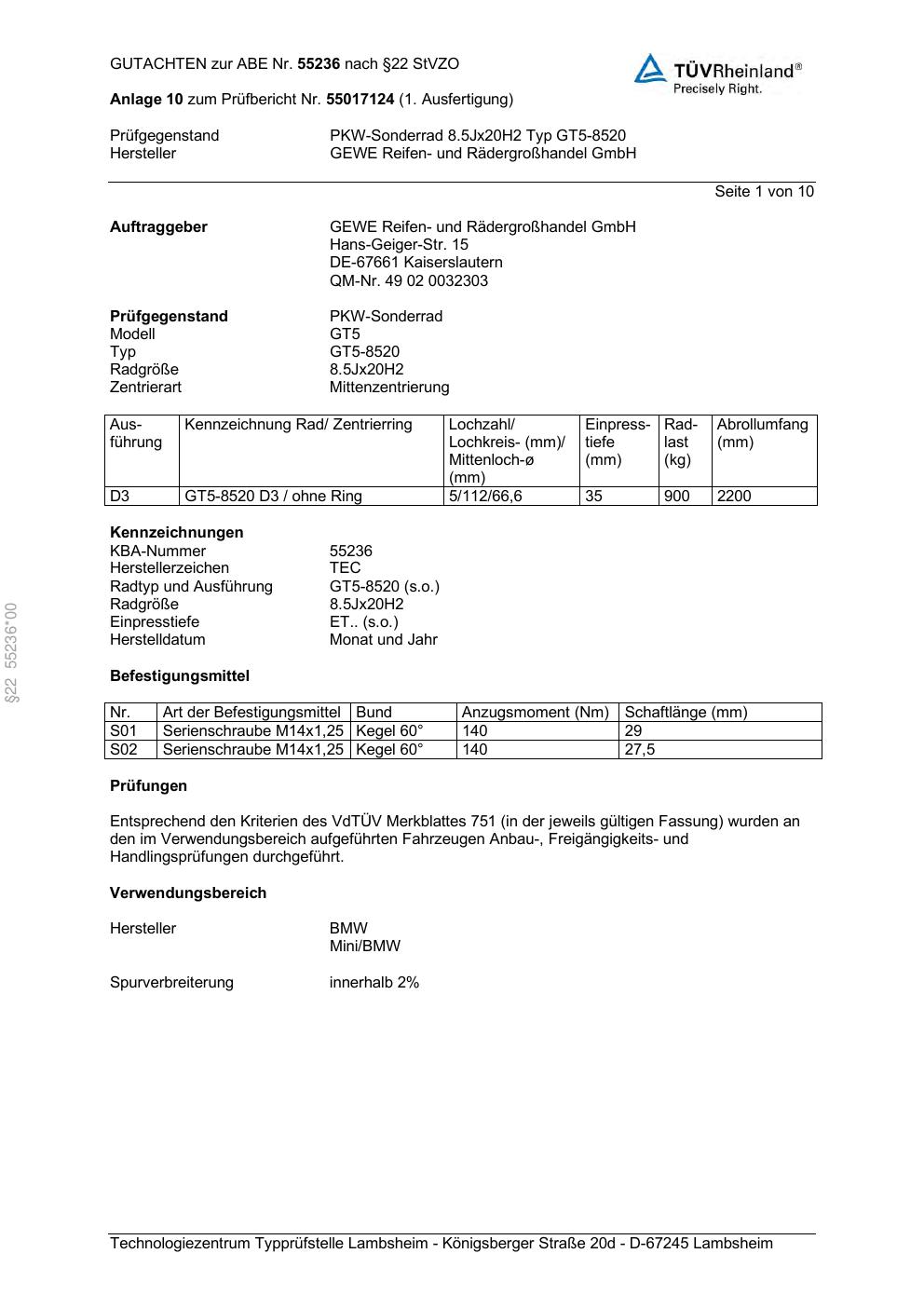 Dieses Gutachten (abe) bezieht sich auf die Alufelge GEWE GT5-8520 in der Ausführung ET 0, Mittenloch 0 mm (KBA 55236). Im PDF findest du typischerweise zulässige Reifengrößen, Auflagen/Anbauhinweise und – je nach Dokument – Hinweise zur Eintragung.