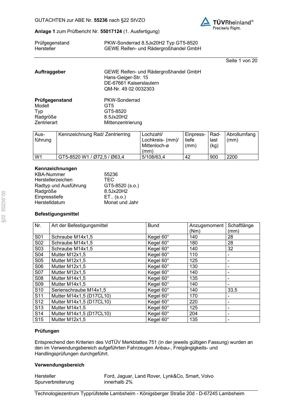 Dieses Gutachten (abe) bezieht sich auf die Alufelge GEWE GT5-8520 in der Ausführung ET 0, Mittenloch 0 mm (KBA 55236). Im PDF findest du typischerweise zulässige Reifengrößen, Auflagen/Anbauhinweise und – je nach Dokument – Hinweise zur Eintragung.