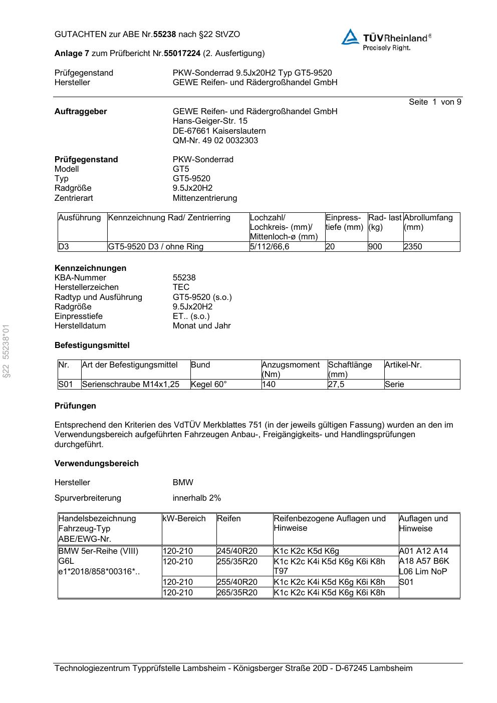 Dieses Gutachten (abe) bezieht sich auf die Alufelge GEWE GT5-9520 in der Ausführung ET 0, Mittenloch 0 mm (KBA 55238). Im PDF findest du typischerweise zulässige Reifengrößen, Auflagen/Anbauhinweise und – je nach Dokument – Hinweise zur Eintragung.