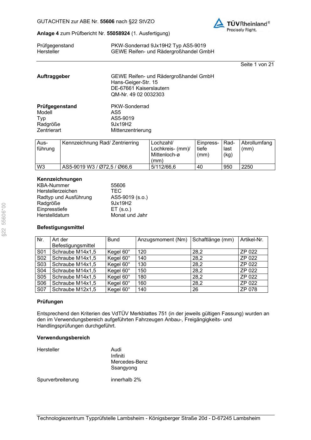 Dieses Gutachten (abe) bezieht sich auf die Alufelge GEWE AS5-9019 in der Ausführung ET 0, Mittenloch 0 mm (KBA 55606). Im PDF findest du typischerweise zulässige Reifengrößen, Auflagen/Anbauhinweise und – je nach Dokument – Hinweise zur Eintragung.