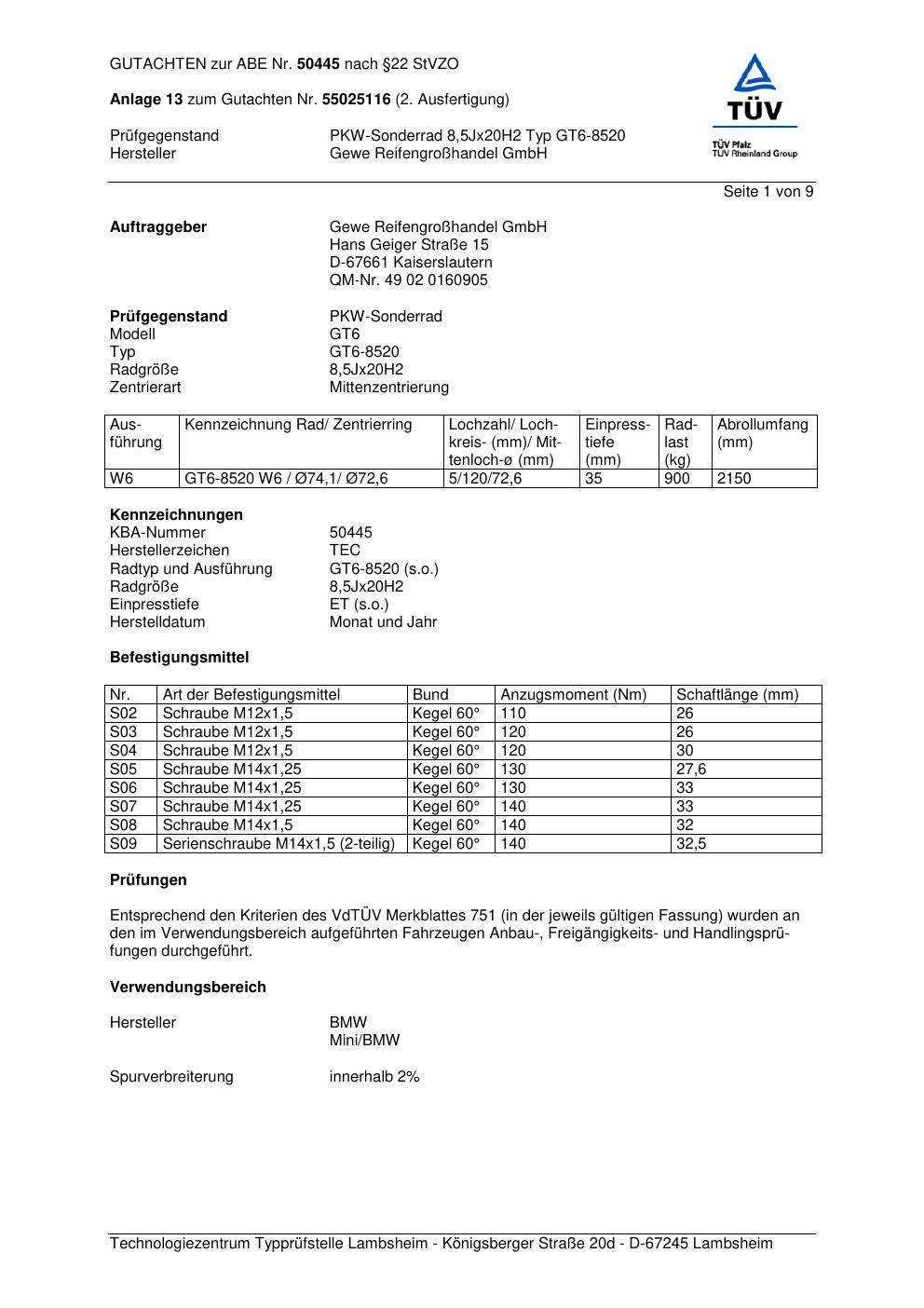 Dieses Gutachten (abe) bezieht sich auf die Alufelge GEWE GT6-8520 in der Ausführung ET 0, Mittenloch 0 mm (KBA 50445). Im PDF findest du typischerweise zulässige Reifengrößen, Auflagen/Anbauhinweise und – je nach Dokument – Hinweise zur Eintragung.