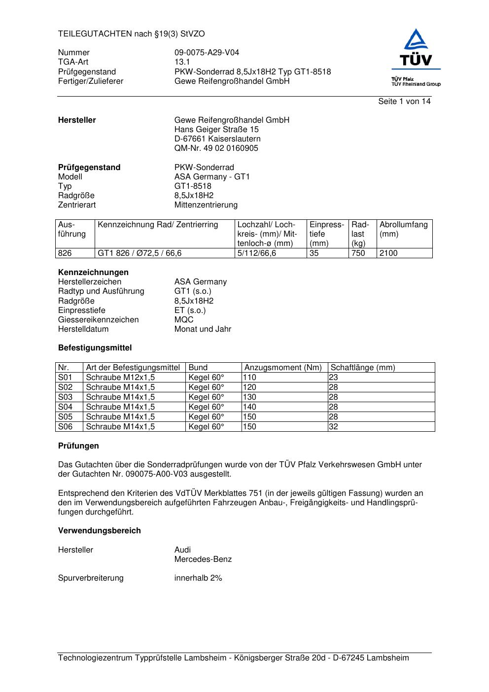 teilegutachten 09-0075-a29-v04 GEWE GT1-8518