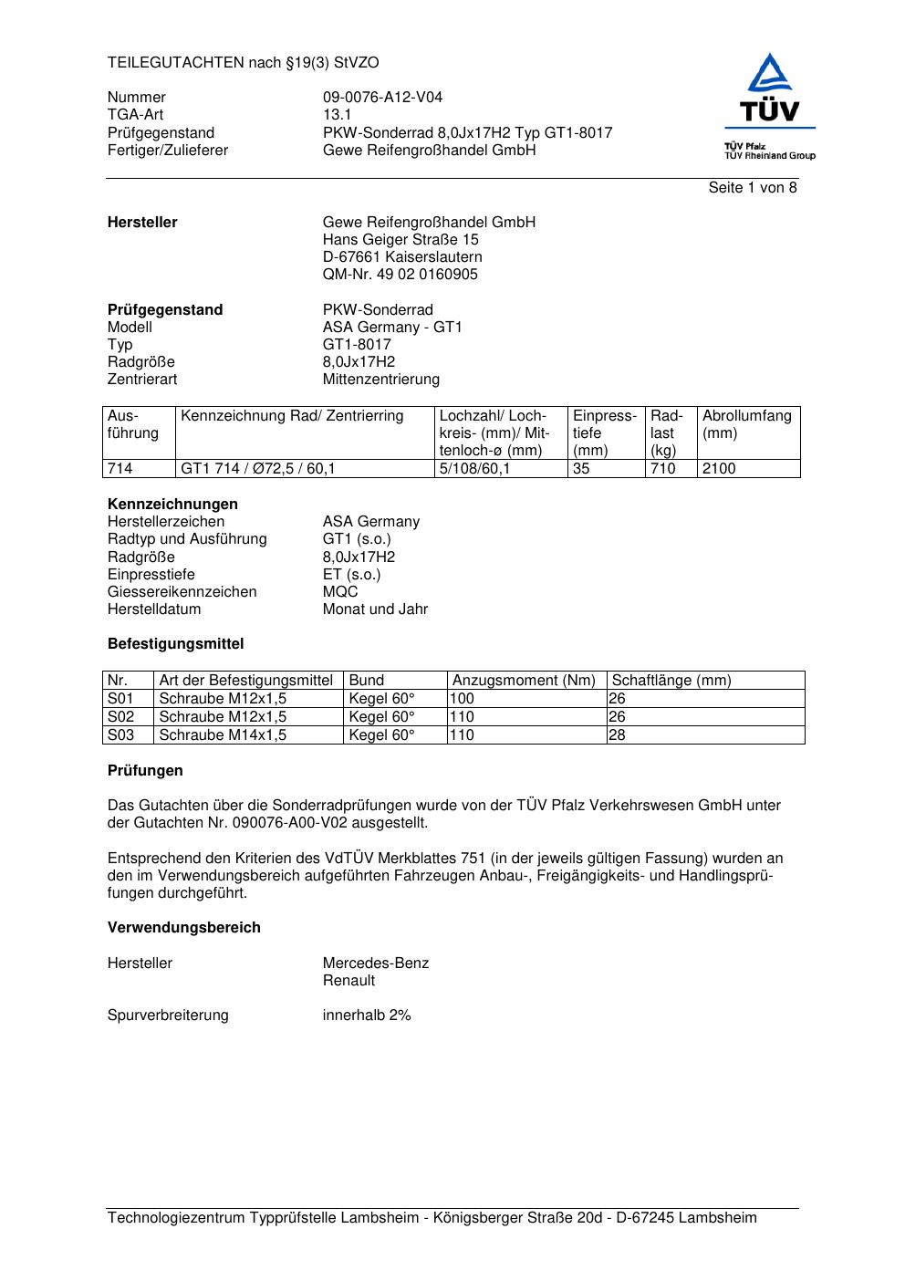 teilegutachten 09-0076-a12-v04 Gewe Reifengroßhandel GmbH (ASA Germany) GT1-8017