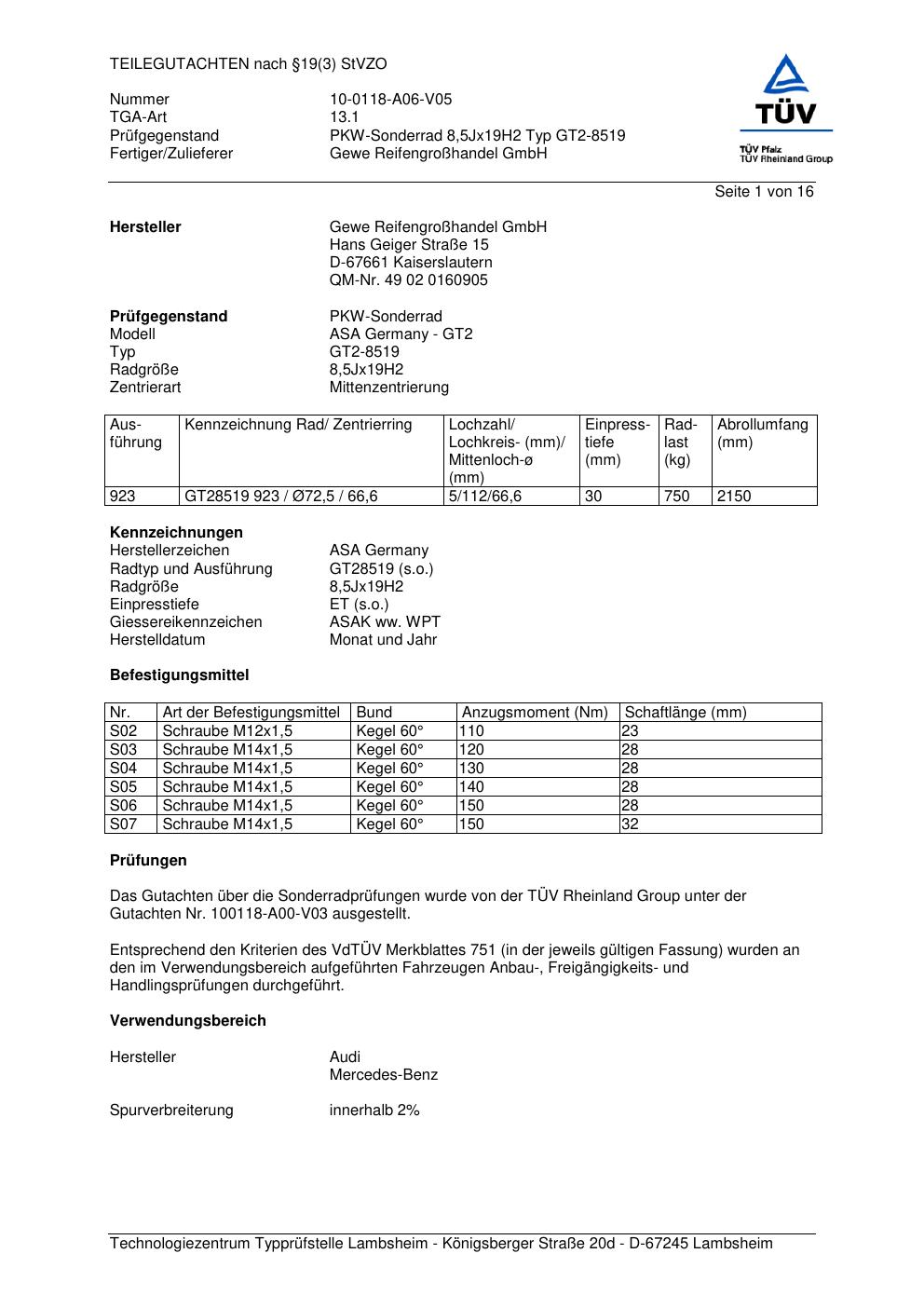 teilegutachten 10-0118-a06-v05 Gewe Reifengroßhandel GmbH (ASA Germany) GT2-8519