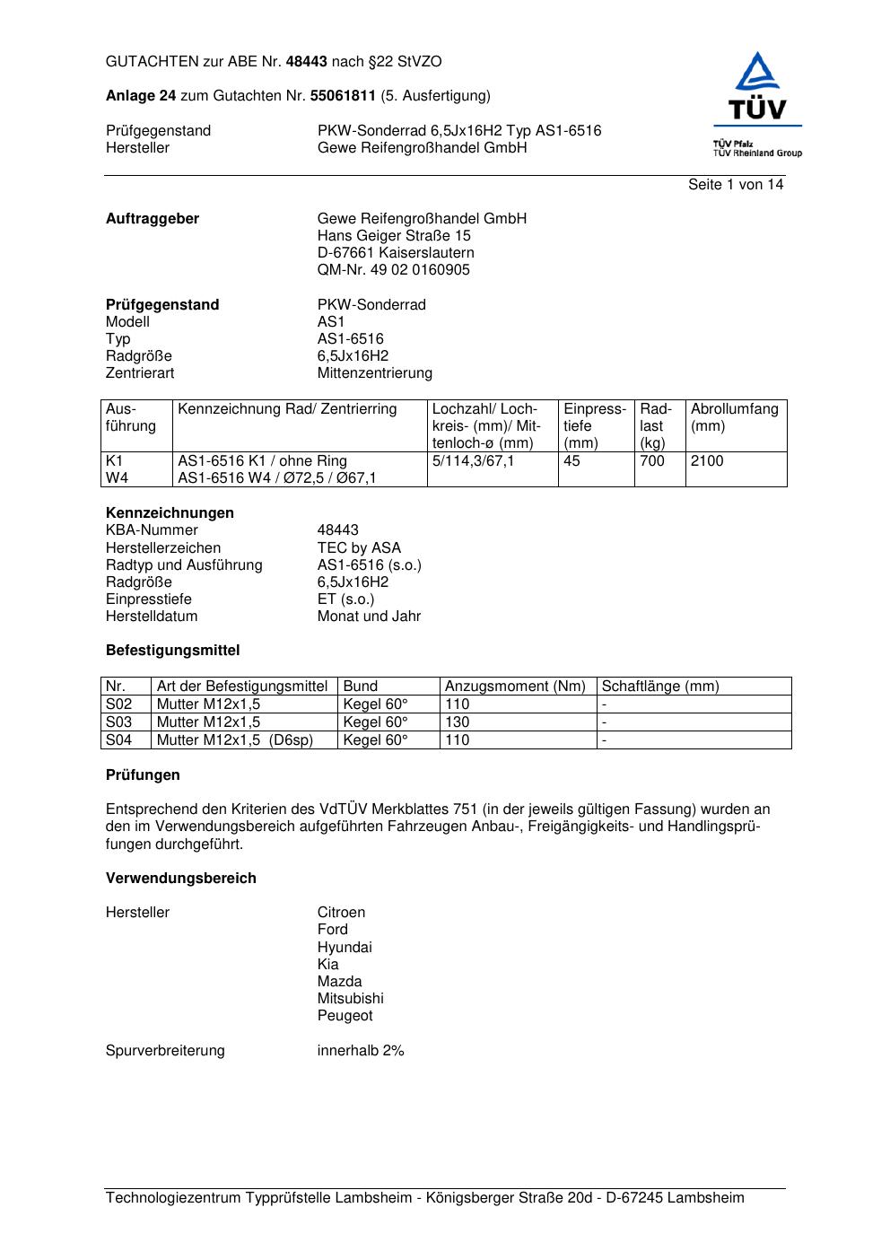 Dieses Gutachten (abe) bezieht sich auf die Alufelge GEWE AS1-6516 in der Ausführung ET 0, Mittenloch 0 mm (KBA 48443). Im PDF findest du typischerweise zulässige Reifengrößen, Auflagen/Anbauhinweise und – je nach Dokument – Hinweise zur Eintragung.