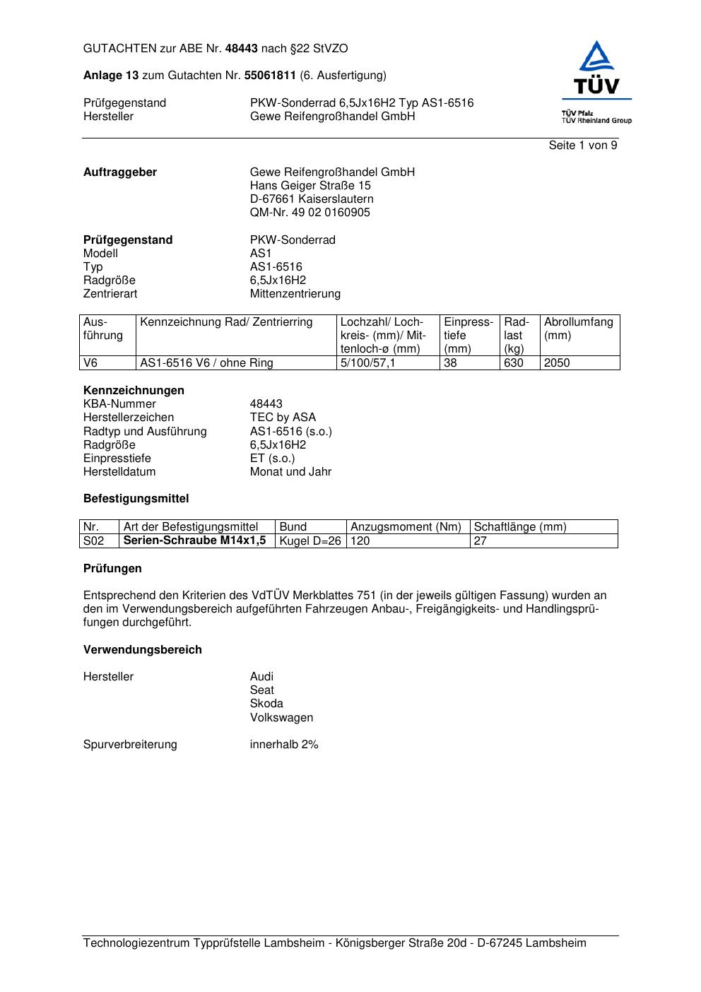 Dieses Gutachten (abe) bezieht sich auf die Alufelge GEWE AS1-6516 in der Ausführung ET 0, Mittenloch 0 mm (KBA 48443). Im PDF findest du typischerweise zulässige Reifengrößen, Auflagen/Anbauhinweise und – je nach Dokument – Hinweise zur Eintragung.