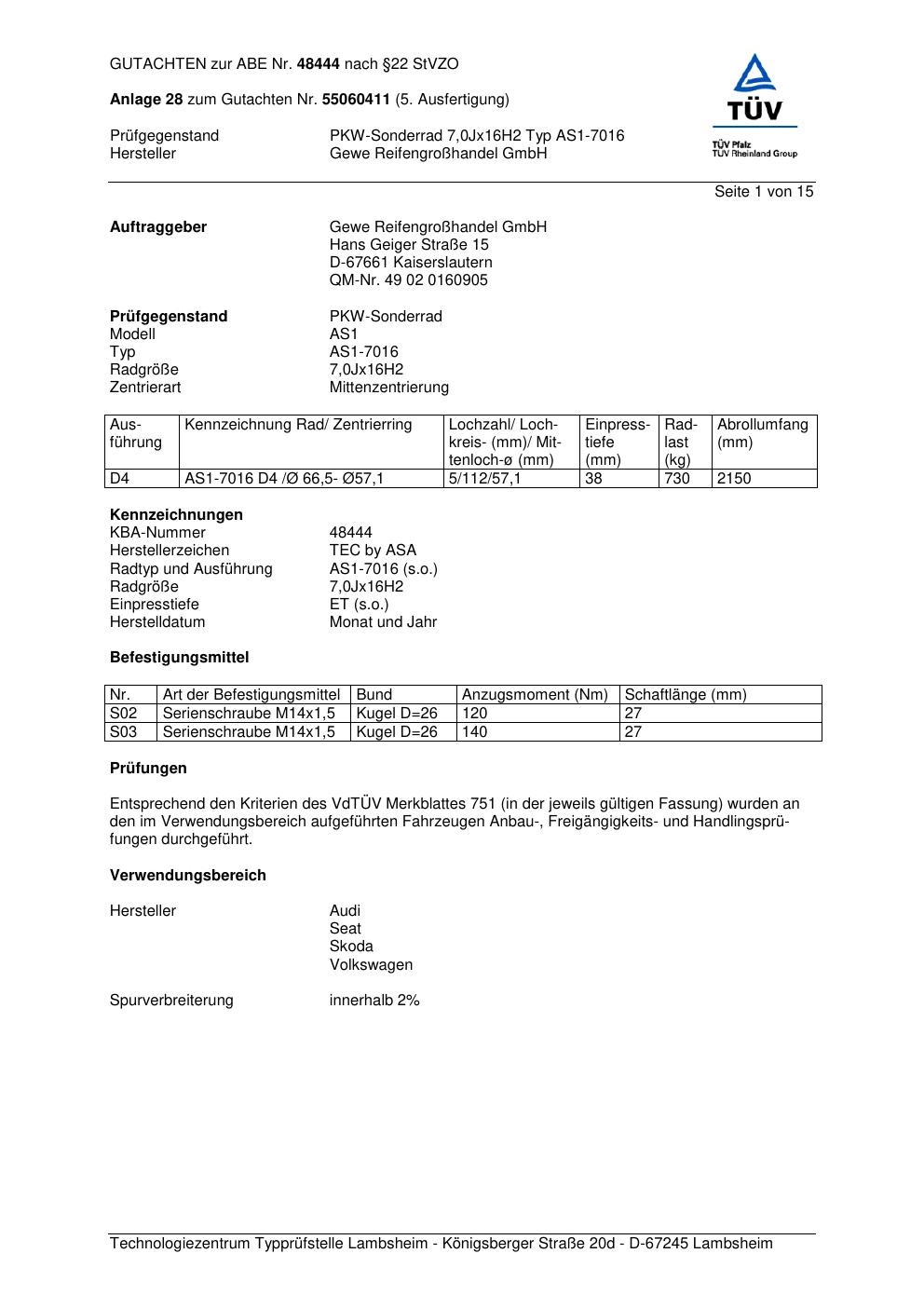 Dieses Gutachten (abe) bezieht sich auf die Alufelge GEWE AS1-7016 in der Ausführung ET 0, Mittenloch 0 mm (KBA 48444). Im PDF findest du typischerweise zulässige Reifengrößen, Auflagen/Anbauhinweise und – je nach Dokument – Hinweise zur Eintragung.