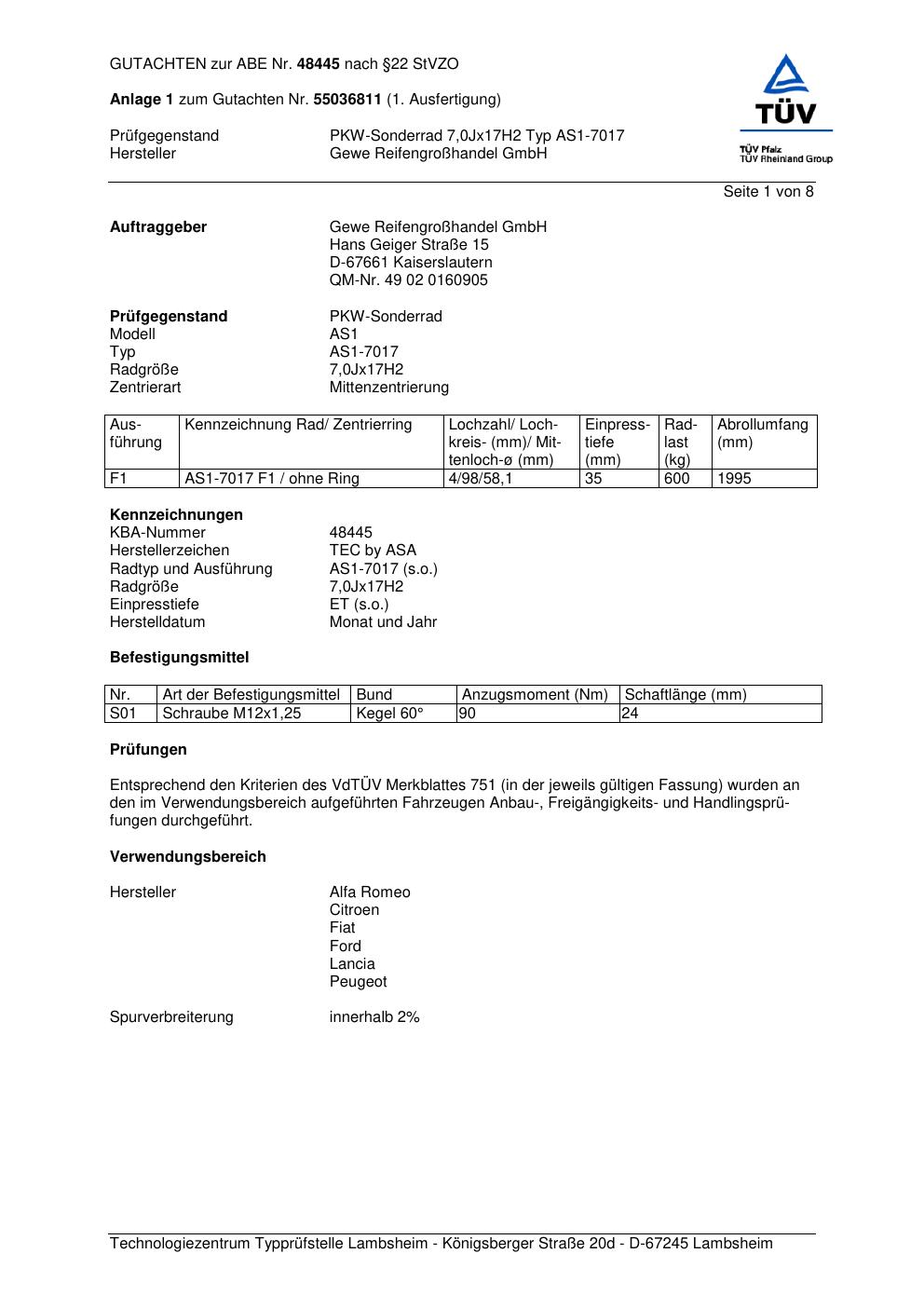 Dieses Gutachten (abe) bezieht sich auf die Alufelge GEWE AS1-7017 in der Ausführung ET 0, Mittenloch 0 mm (KBA 48445). Im PDF findest du typischerweise zulässige Reifengrößen, Auflagen/Anbauhinweise und – je nach Dokument – Hinweise zur Eintragung.