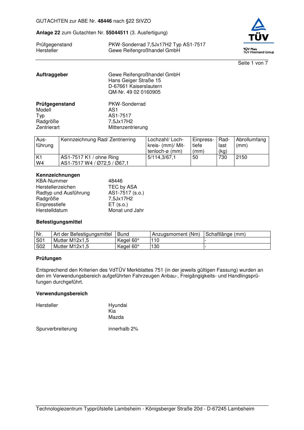Dieses Gutachten (abe) bezieht sich auf die Alufelge GEWE AS1-7517 in der Ausführung ET 0, Mittenloch 0 mm (KBA 48446). Im PDF findest du typischerweise zulässige Reifengrößen, Auflagen/Anbauhinweise und – je nach Dokument – Hinweise zur Eintragung.