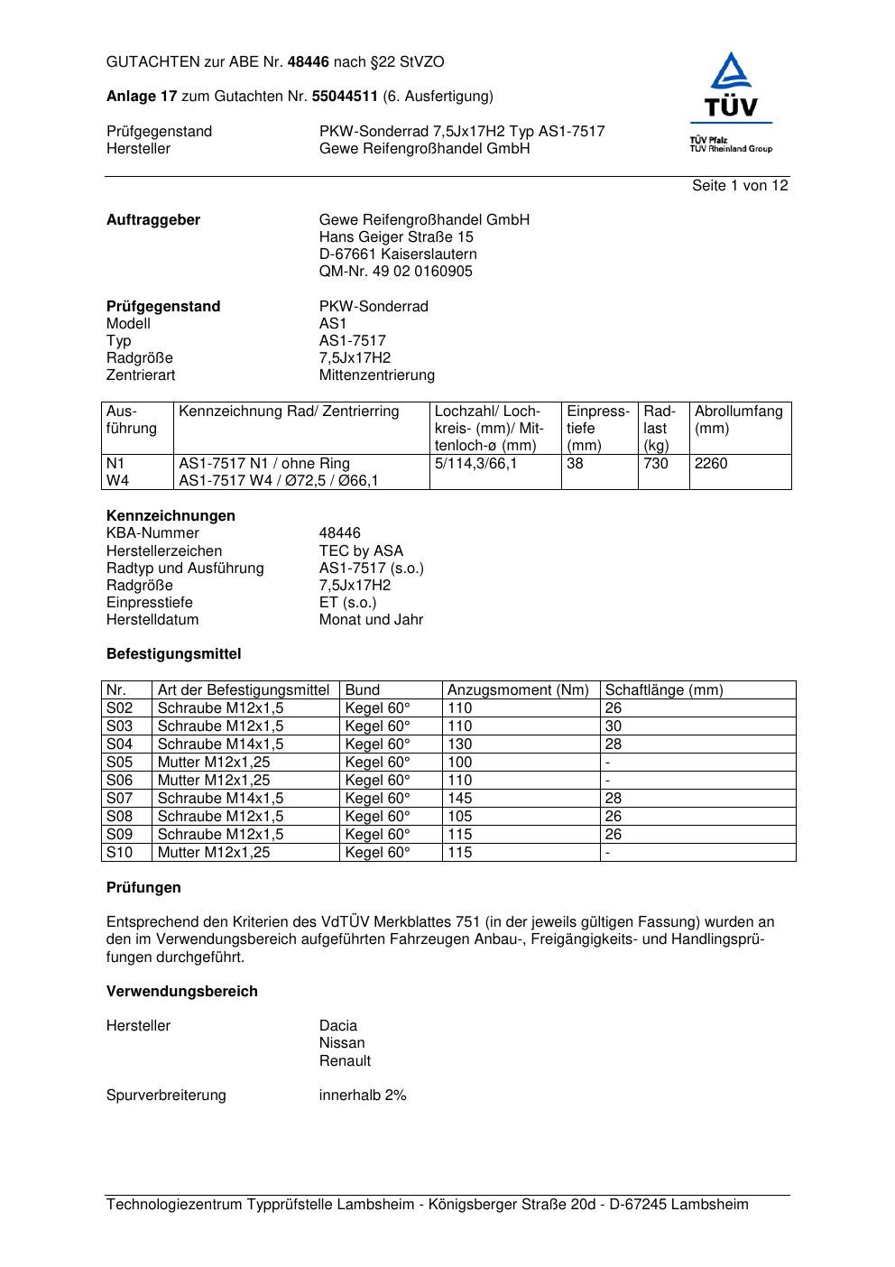 Dieses Gutachten (abe) bezieht sich auf die Alufelge GEWE AS1-7517 in der Ausführung ET 0, Mittenloch 0 mm (KBA 48446). Im PDF findest du typischerweise zulässige Reifengrößen, Auflagen/Anbauhinweise und – je nach Dokument – Hinweise zur Eintragung.