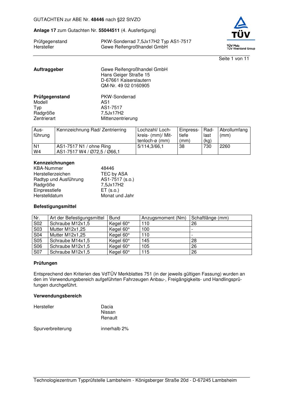Dieses Gutachten (abe) bezieht sich auf die Alufelge GEWE AS1-7517 in der Ausführung ET 0, Mittenloch 0 mm (KBA 48446). Im PDF findest du typischerweise zulässige Reifengrößen, Auflagen/Anbauhinweise und – je nach Dokument – Hinweise zur Eintragung.