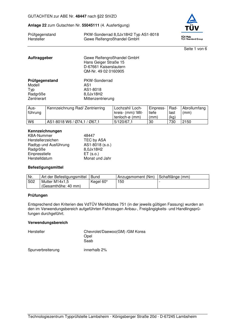 Dieses Gutachten (abe) bezieht sich auf die Alufelge GEWE AS1-8018 in der Ausführung ET 0, Mittenloch 0 mm (KBA 48447). Im PDF findest du typischerweise zulässige Reifengrößen, Auflagen/Anbauhinweise und – je nach Dokument – Hinweise zur Eintragung.