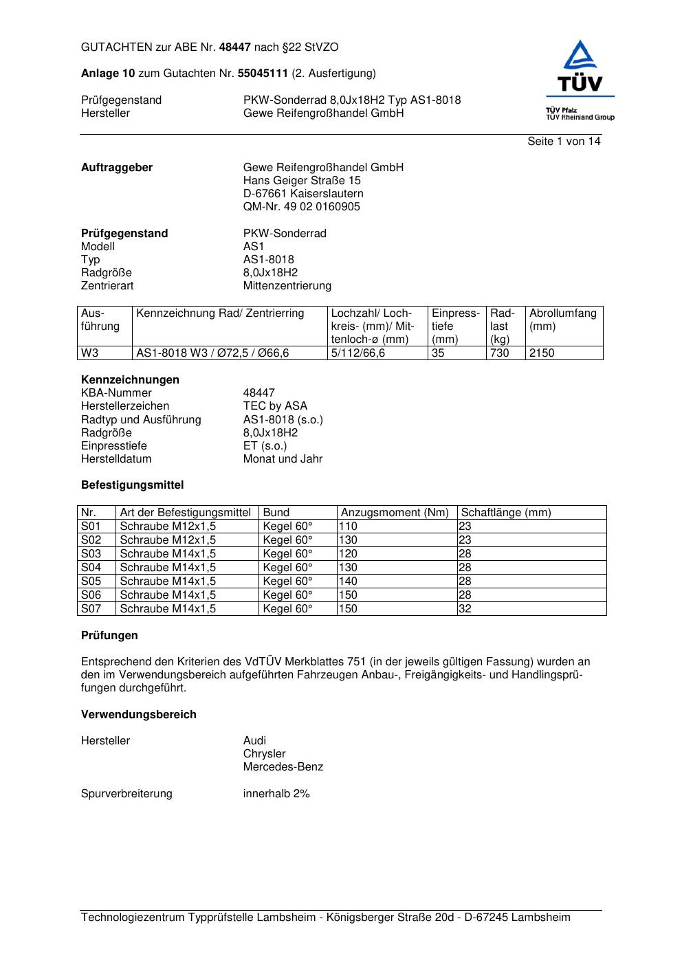- Gewe Reifengroßhandel GmbH (Hersteller); Herstellerzeichen: TEC by ASA AS1-8018 – 0.0Jx0 ET0.0 (KBA 48447)