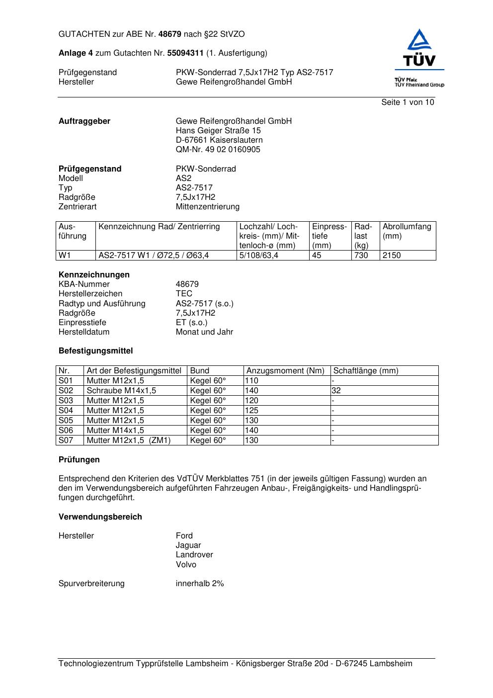 Dieses Gutachten (abe) bezieht sich auf die Alufelge GEWE AS2-7517 in der Ausführung ET 0, Mittenloch 0 mm (KBA 48679). Im PDF findest du typischerweise zulässige Reifengrößen, Auflagen/Anbauhinweise und – je nach Dokument – Hinweise zur Eintragung.