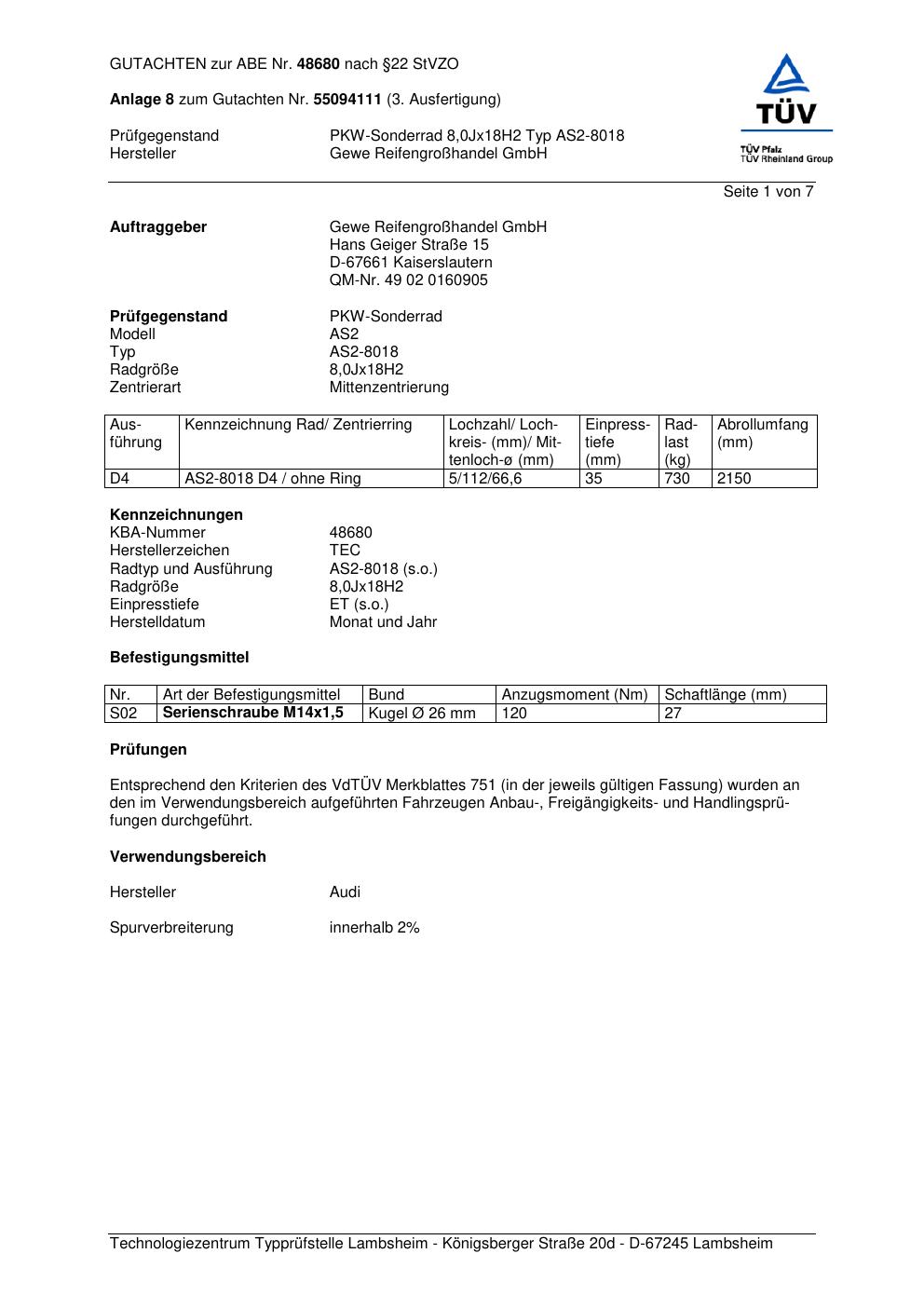 Dieses Gutachten (abe) bezieht sich auf die Alufelge GEWE AS2-8018 in der Ausführung ET 0, Mittenloch 0 mm (KBA 48680). Im PDF findest du typischerweise zulässige Reifengrößen, Auflagen/Anbauhinweise und – je nach Dokument – Hinweise zur Eintragung.