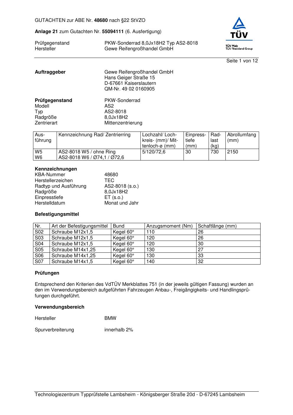 Dieses Gutachten (abe) bezieht sich auf die Alufelge GEWE AS2-8018 in der Ausführung ET 0, Mittenloch 0 mm (KBA 48680). Im PDF findest du typischerweise zulässige Reifengrößen, Auflagen/Anbauhinweise und – je nach Dokument – Hinweise zur Eintragung.