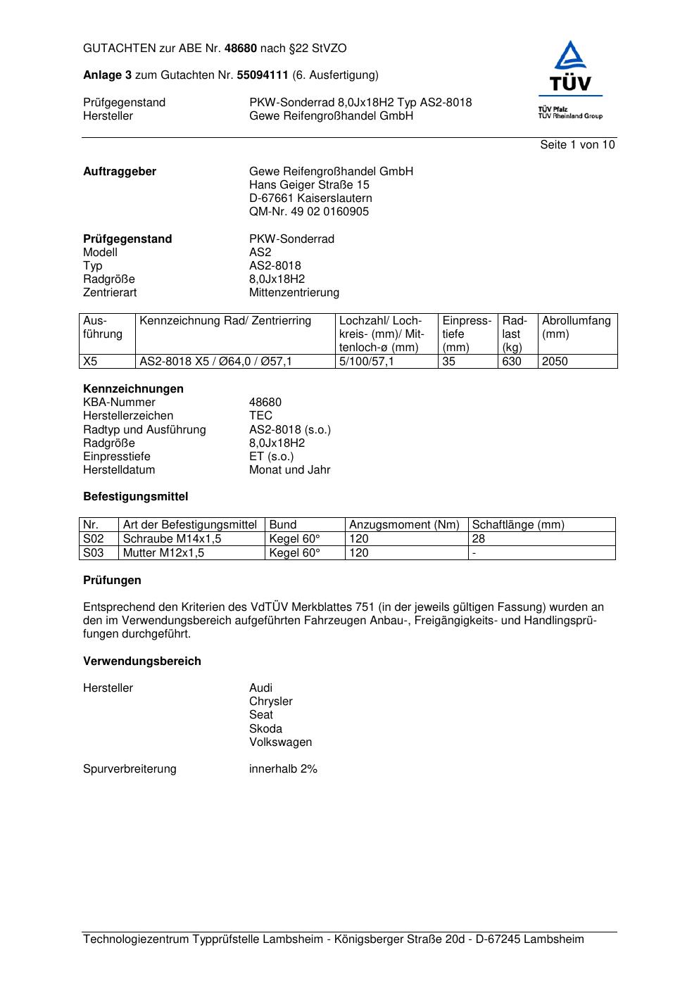 Felgengutachten / abe für Alufelgen GEWE AS2 -8018 (ET 0, Mittenloch 0 mm) mit KBA 48680 (Zertifikatsnummer 48680). Hier kostenlos als PDF herunterladen. Der Download-Link ist 24 Stunden gültig und kann bis zu zwei Mal verwendet werden.