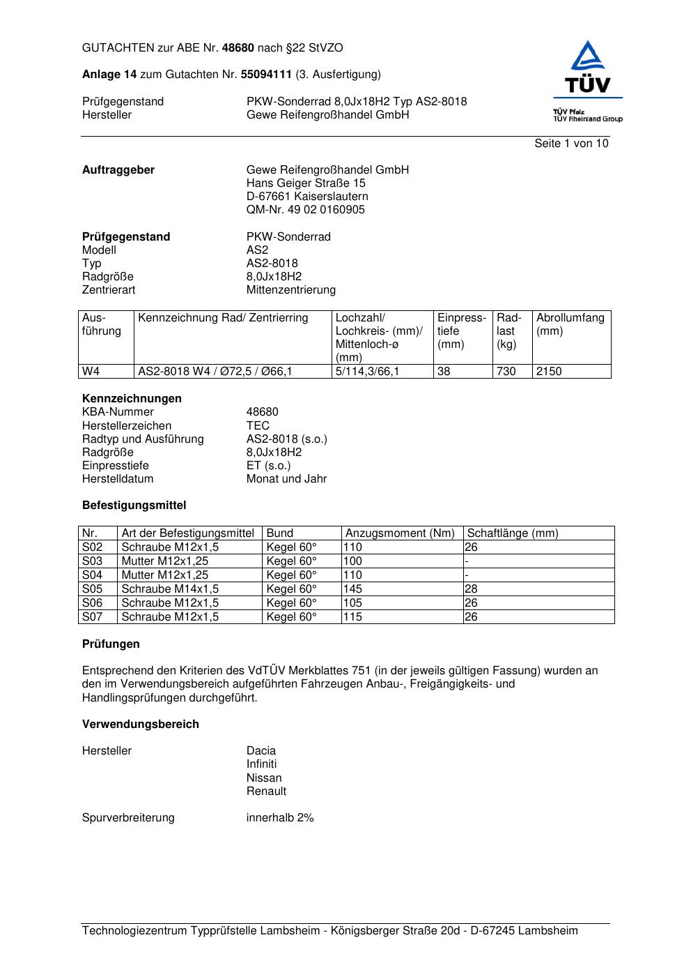 Dieses Gutachten (abe) bezieht sich auf die Alufelge GEWE AS2-8018 in der Ausführung ET 0, Mittenloch 0 mm (KBA 48680). Im PDF findest du typischerweise zulässige Reifengrößen, Auflagen/Anbauhinweise und – je nach Dokument – Hinweise zur Eintragung.