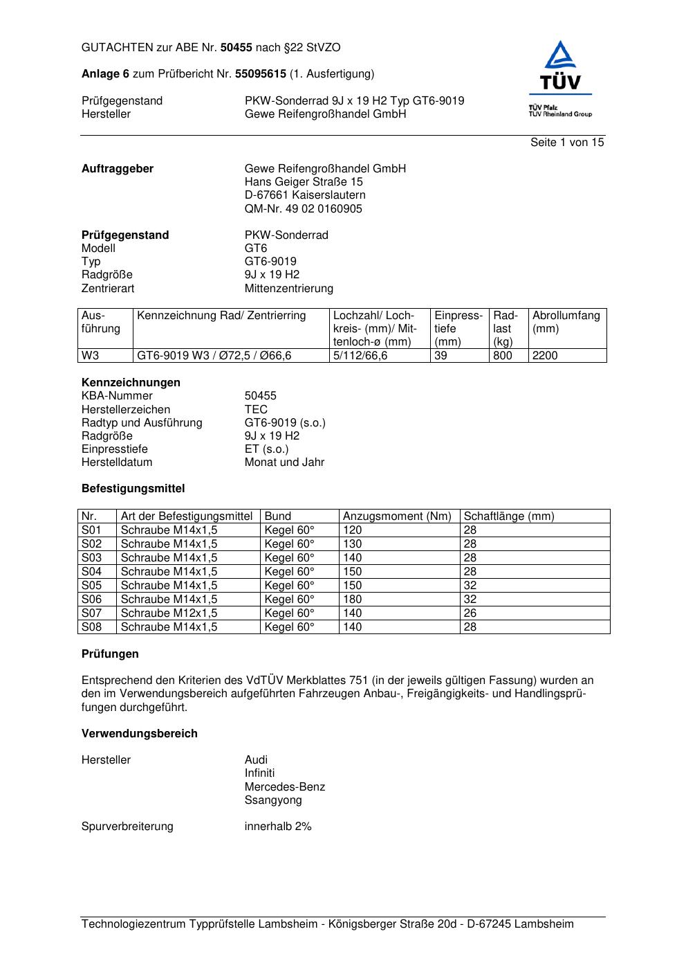 Dieses Gutachten (abe) bezieht sich auf die Alufelge GEWE GT6-9019 in der Ausführung ET 0, Mittenloch 0 mm (KBA 50455). Im PDF findest du typischerweise zulässige Reifengrößen, Auflagen/Anbauhinweise und – je nach Dokument – Hinweise zur Eintragung.
