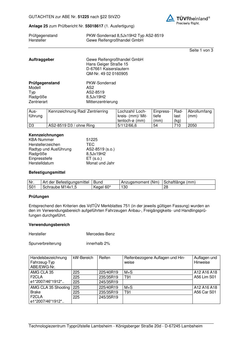Dieses Gutachten (abe) bezieht sich auf die Alufelge GEWE AS2-8519 in der Ausführung ET 0, Mittenloch 0 mm (KBA 51225). Im PDF findest du typischerweise zulässige Reifengrößen, Auflagen/Anbauhinweise und – je nach Dokument – Hinweise zur Eintragung.