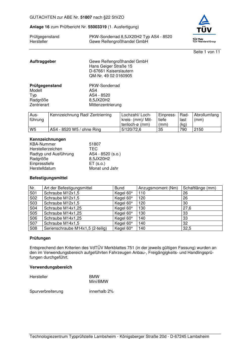 Felgengutachten / abe für Alufelgen GEWE AS4 - 85 20 (ET 0, Mittenloch 0 mm) mit KBA 51807 (Zertifikatsnummer 51807). Hier kostenlos als PDF herunterladen. Der Download-Link ist 24 Stunden gültig und kann bis zu zwei Mal verwendet werden.