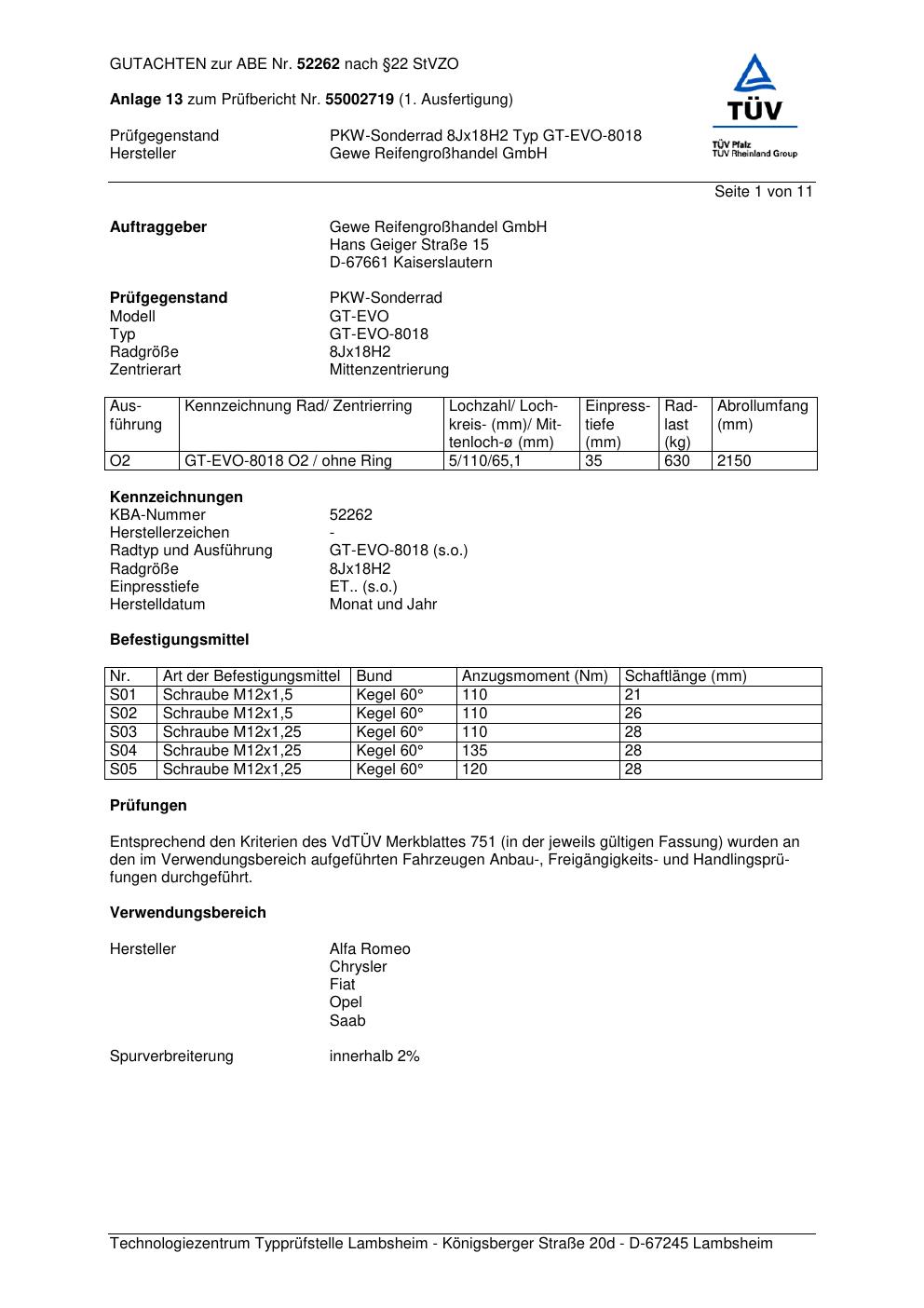 Dieses Gutachten (abe) bezieht sich auf die Alufelge GEWE GT-EVO-8018 in der Ausführung ET 0, Mittenloch 0 mm (KBA 52262). Im PDF findest du typischerweise zulässige Reifengrößen, Auflagen/Anbauhinweise und – je nach Dokument – Hinweise zur Eintragung.