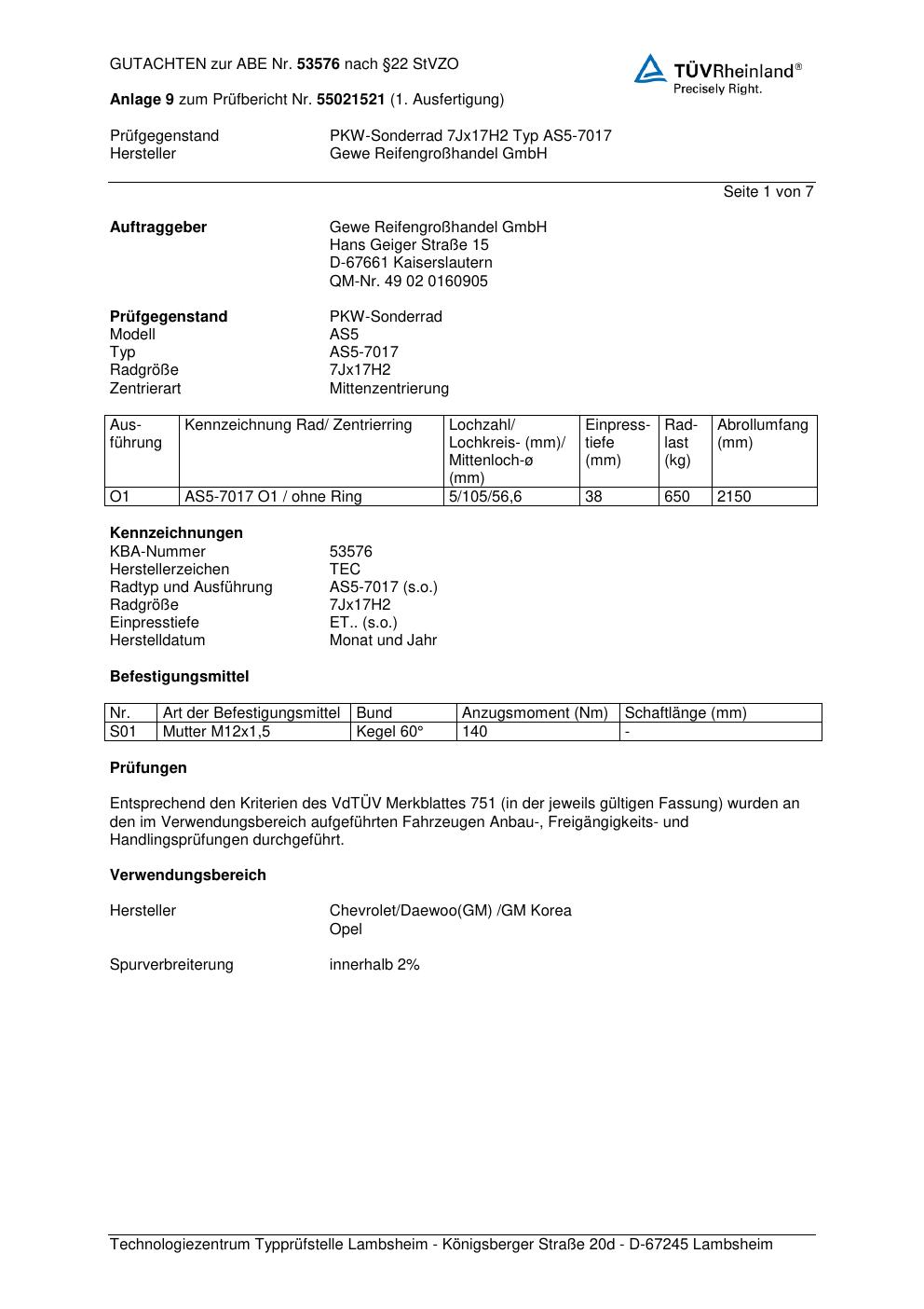Dieses Gutachten (abe) bezieht sich auf die Alufelge GEWE AS5-7017 in der Ausführung ET 0, Mittenloch 0 mm (KBA 53576). Im PDF findest du typischerweise zulässige Reifengrößen, Auflagen/Anbauhinweise und – je nach Dokument – Hinweise zur Eintragung.