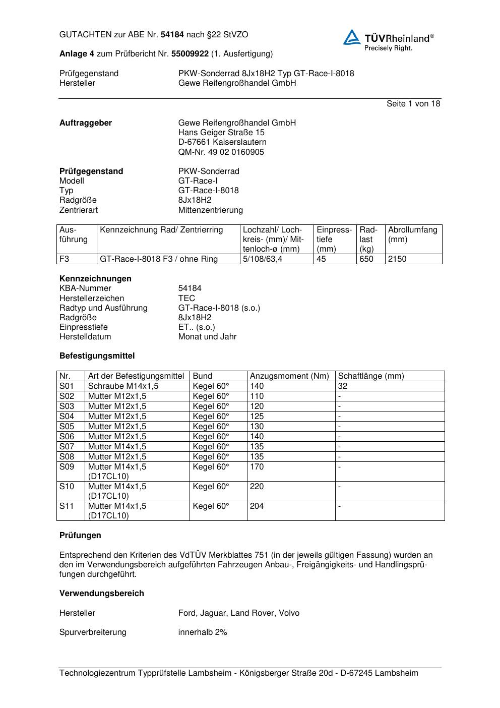 Dieses Gutachten (abe) bezieht sich auf die Alufelge GEWE GT-Race-I-8018 in der Ausführung ET 0, Mittenloch 0 mm (KBA 54184). Im PDF findest du typischerweise zulässige Reifengrößen, Auflagen/Anbauhinweise und – je nach Dokument – Hinweise zur Eintragung.