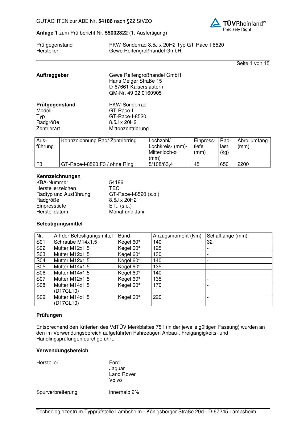 Dieses Gutachten (abe) bezieht sich auf die Alufelge GEWE GT-Rac e-I-8520 in der Ausführung ET 0, Mittenloch 0 mm (KBA 54186). Im PDF findest du typischerweise zulässige Reifengrößen, Auflagen/Anbauhinweise und – je nach Dokument – Hinweise zur Eintragung.