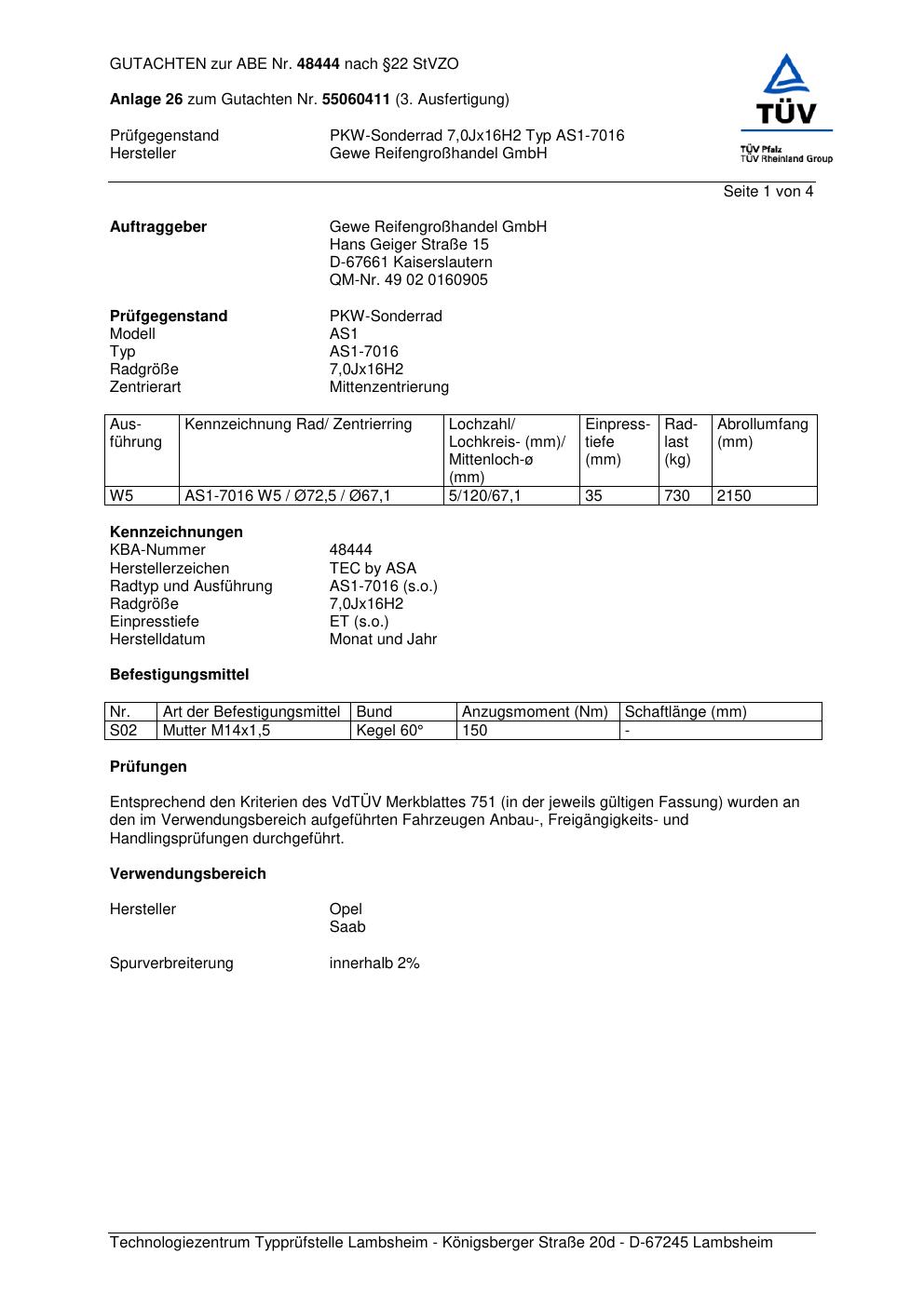 Dieses Gutachten (abe) bezieht sich auf die Alufelge Gewe Reifengroshandel GmbH AS1-7016 in der Ausführung ET 0, Mittenloch 0 mm (KBA 48444). Im PDF findest du typischerweise zulässige Reifengrößen, Auflagen/Anbauhinweise und – je nach Dokument – Hinweise zur Eintragung.
