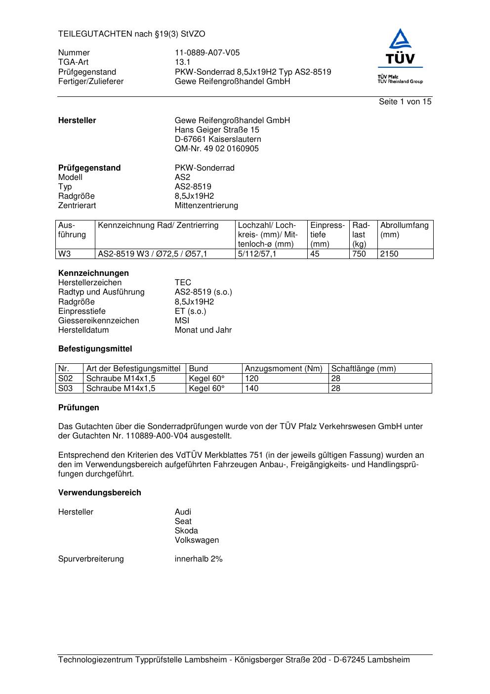 Felgengutachten / teilegutachten für Alufelgen GEWE AS2-8519 (ET 0, Mittenloch 0 mm) (Zertifikatsnummer 11-0889-a07-v05). Hier kostenlos als PDF herunterladen. Der Download-Link ist 24 Stunden gültig und kann bis zu zwei Mal verwendet werden.